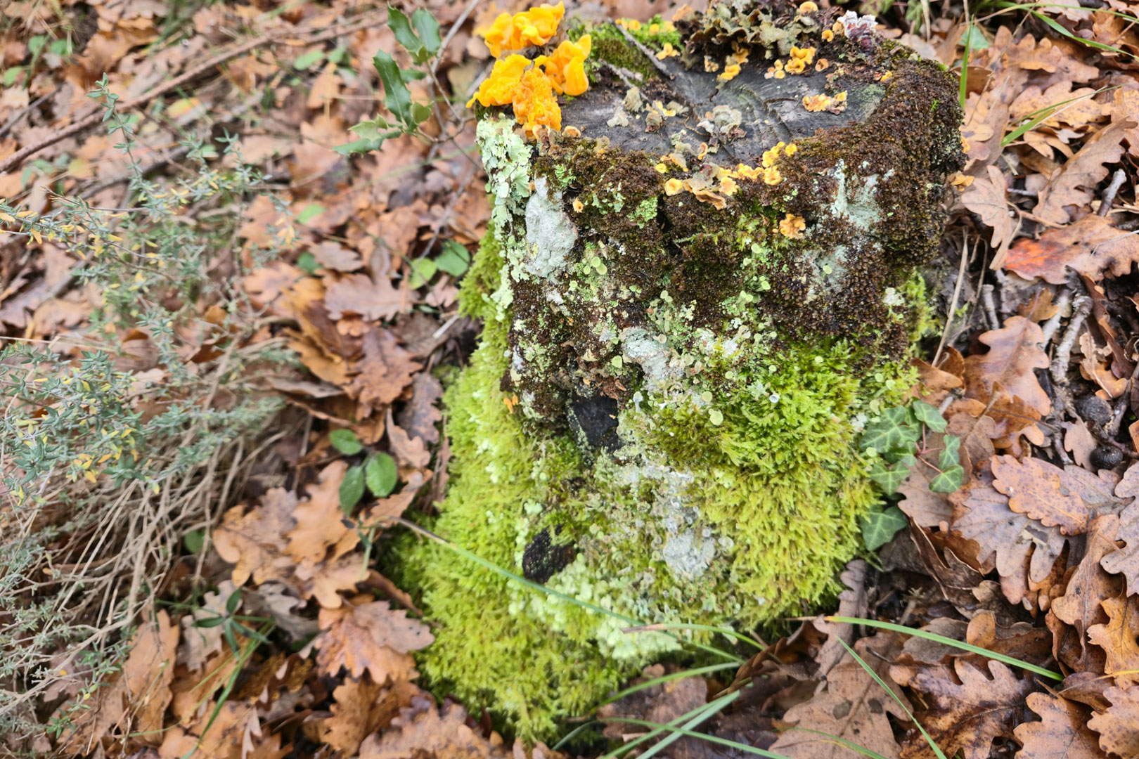 Les lichens, symbioses entre algues et champignons, sont des pionniers capables d’occuper des substrats pauvres en nutriments comme le bois mort. Les crustoses, de petite taille, se développent sur les troncs et souches, tandis que les macrolichens, se trouvent souvent sur le bois mort au sol. Certains lichens sécrètent même des acides limitant la croissance d’organismes concurrents, tels que certains champignons.