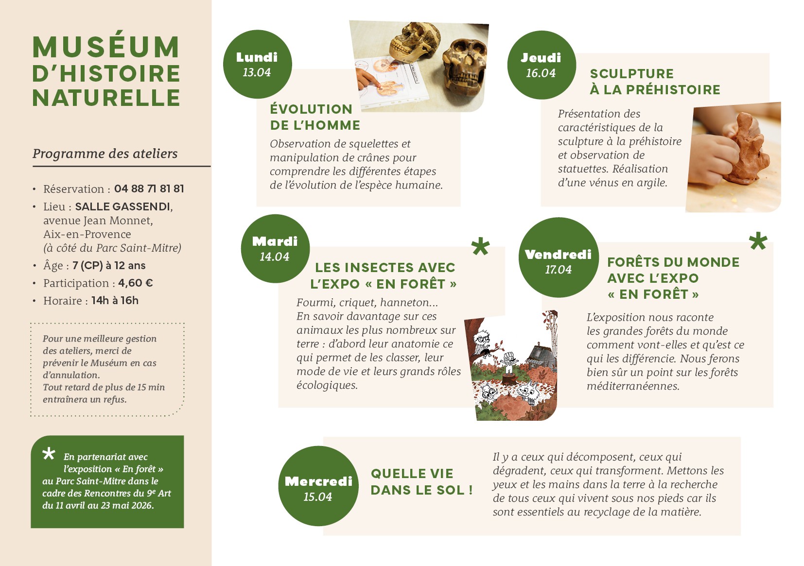 Museum d'histoire naturelle - Salle Gassendi 166, avenue Jean Monnet, Aix-en-Provence, FranceCes ateliers se déroulent salle Gassendi, avenue Jean Monnet à Aix-en-Provence, de 14h à 16h (à côté du Parc Saint-Mitre).Lundi 13 avril : Évolution de l’HommeObservation de squelettes et manipulation de crânes pour comprendre les différentes étapes de l’évolution de l’espèce humaine.Mardi 14 avril : Les insectes avec l’expo « En forêt »*Fourmi, criquet, hanneton... […]