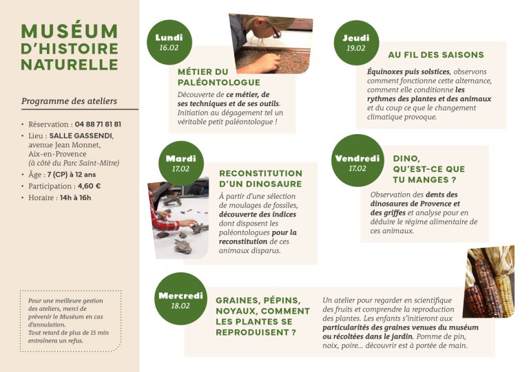 Le Muséum d’Histoire Naturelle d’Aix-en-Provence propose d’accueillir les enfants âgés de 7 à 12 ans lors de ses ateliers pédagogiques des vacances d’hiver 2026.